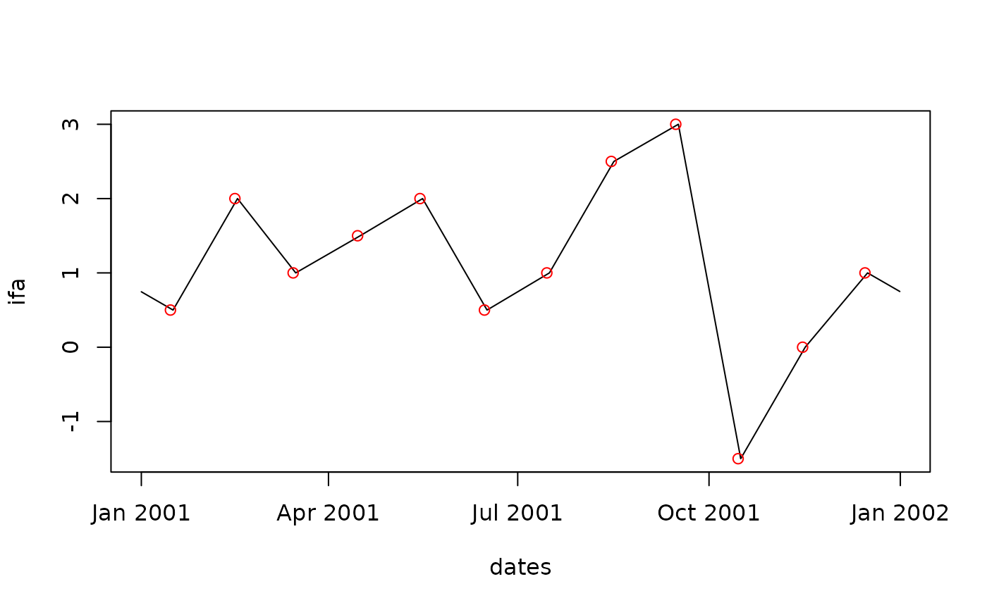 points(as.POSIXct(paste0("2001-", 1:12, "-15"), tz = "UTC"), factors, col = "red")